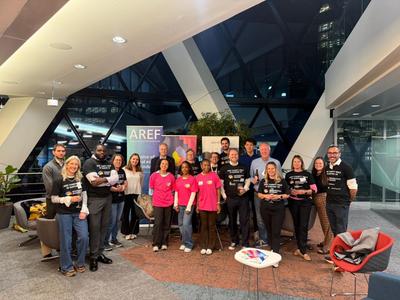 The evening began outside The Gherkin, St Mary Axe, where walkers collected their AREF Charity Walk T-shirts before setting off on a relaxed 3-mile route along the Thames. It was a warm evening, with just a light shower as the group crossed Tower Bridge, but otherwise perfect conditions for a riverside walk.
